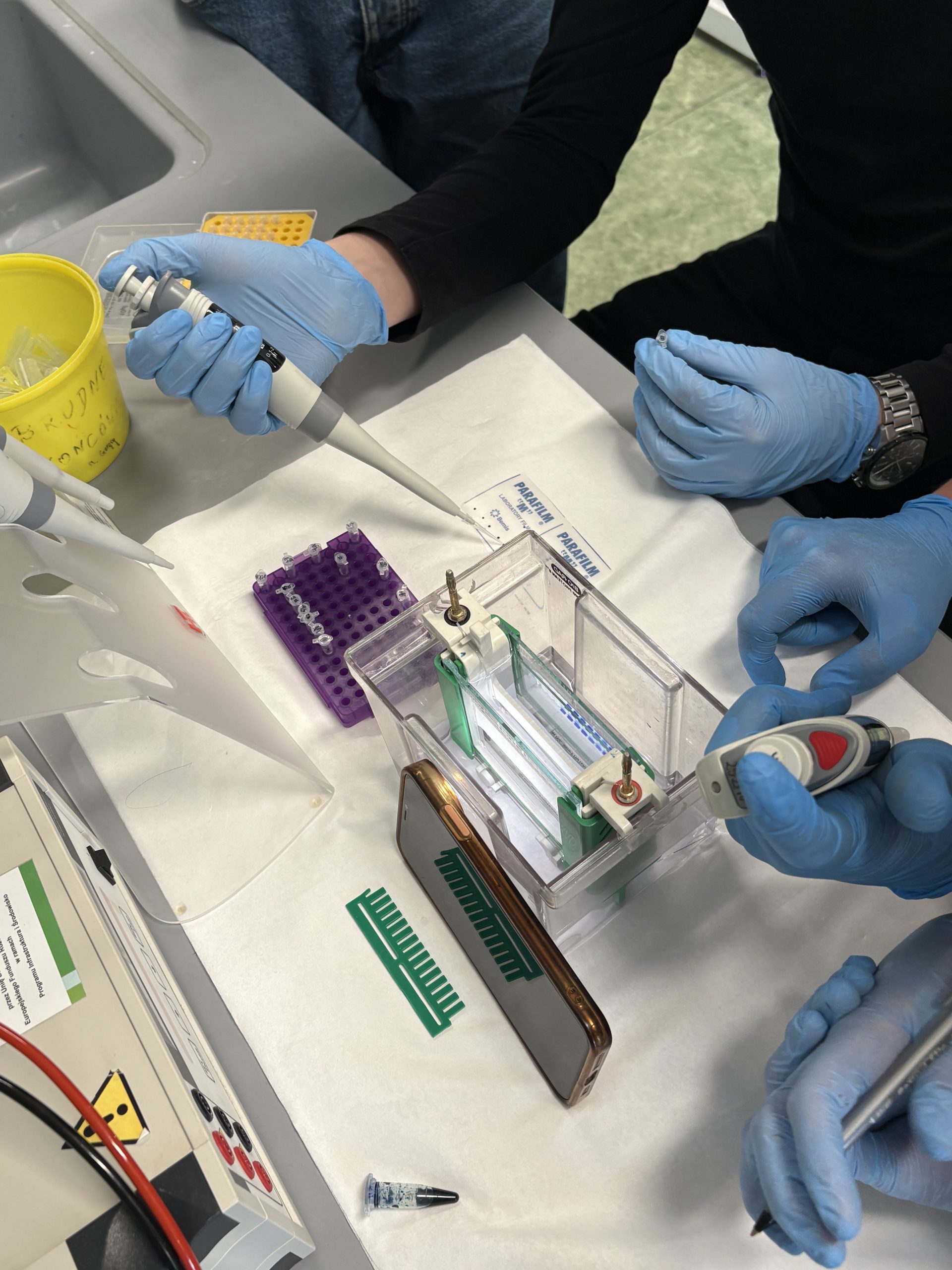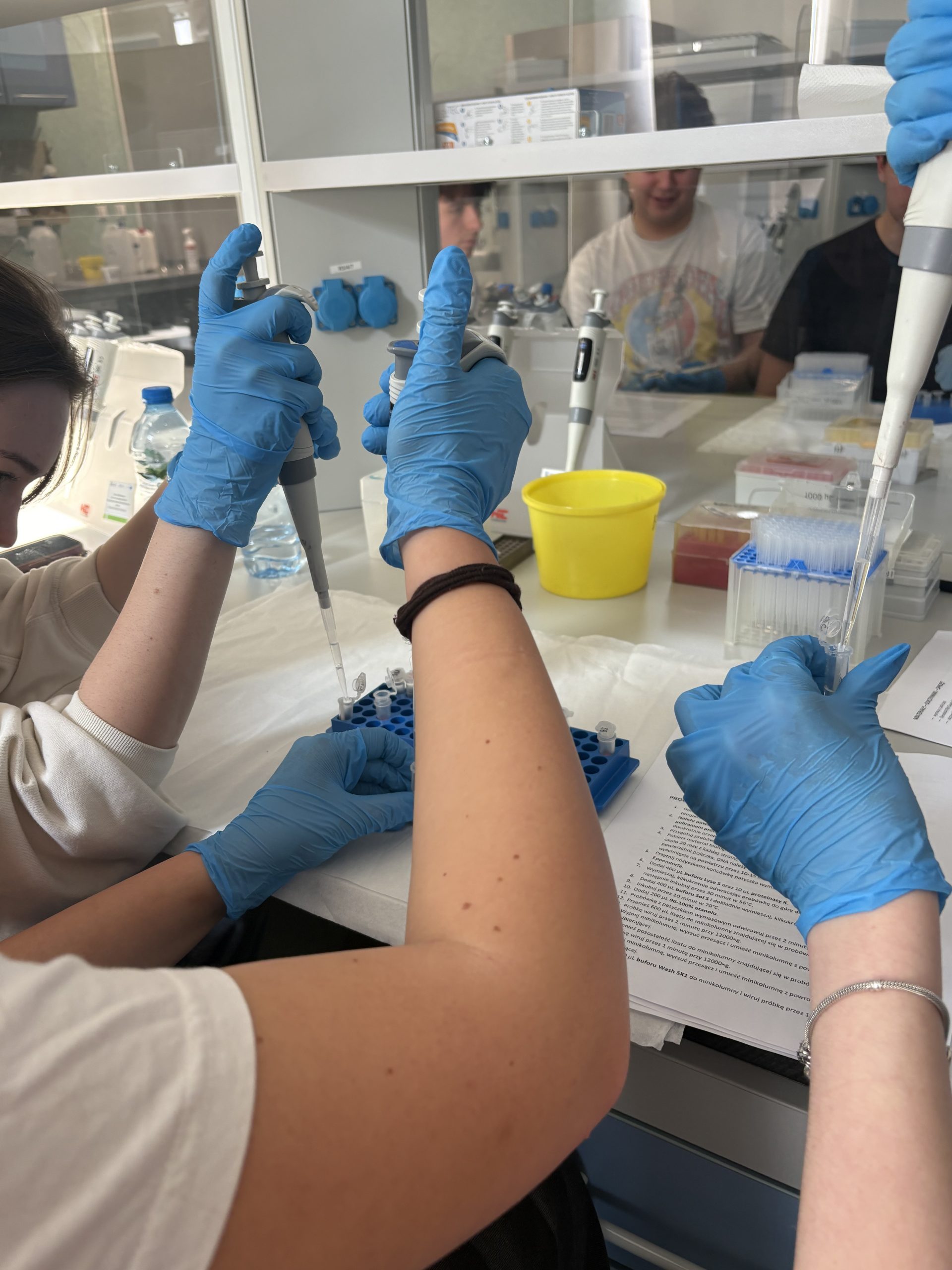 Uczniowie wykonali izolowanie DNA pochodzącego z komórek nabłonka jamy ustnej, następnie amplifikację fragmentu genu CCR5, po której mogli przeanalizować otrzymane wyniki za pomocą elektroforezy żelowej. Cel i sposób przeprowadzenia każdego z etapów doświadczenia został wyjaśniony przez studentów, a wyniki wspólnie przeanalizowane.
